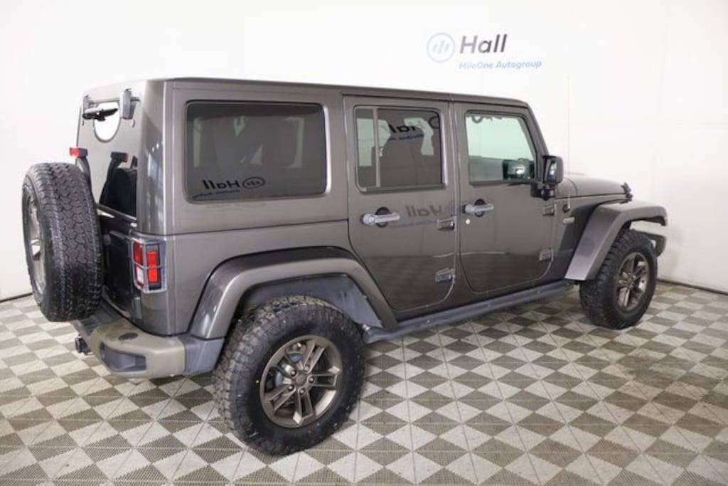 Connectivity Group (Remote USB Port, Tire Pressure Monitoring Display, Uconnect Voice Command w/Bluetooth, and Vehicle Information Center), Jeep 75th Anniversary Package, Quick Order Package 24H 75th Anniversary (DISC) (2 Front & 1 Rear Bronze Tow Hook, 75th Anniversary Badge, Anti-Spin Differential Rear Axle, Body Color Grille w/Bronze Accent, Bronze Jeep Grille Badge, Bronze Steel Front Bumper, Bronze Steel Rear Bumper, Bronze Trail Rated Badge, Chrome/Leather Wrapped Shift Knob, Driver Height Adjuster Seat, Heated Front Seats, Hood w/Power Dome, IP Grab Handle w/75th Anniversary Logo, Leather Seat w/Cloth (Ombre Mesh) (DISC), Low Gloss Black Wrangler Decal, MOPAR Slush Mats, Moroccan Sun Instrument Panel Bezel, Moroccan Sun Interior Accents, Premium Black Sunrider Soft Top, Radio: 430 (DISC), and Wheels: 17 x 7.5 Aluminum Bronze (DISC)), Trailer Tow Group (Class II Receiver Hitch and Trailer Tow w/4-Pin Connector Wiring), 18" x 7.5" Polished Satin Carbon Wheels, 3.21 Rear Axle Ratio, 4-Wheel Disc Brakes, 40GB Hard Drive w/28GB Available, 5-Year SiriusXM Travel Link Service, 6.5" Touchscreen Display, 8 Speakers, ABS brakes, Air Conditioning, Air Conditioning w/Auto Temperature Control, Air Filtering, Alloy wheels, Alpine 9-Speaker w/All Weather Subwoofer, AM/FM radio: SiriusXM, Audio Jack Input for Mobile Devices, Auto-dimming Rear-View mirror, Brake assist, CD player, Cloth Seats w/Adjustable Head Restraints, Compass, Driver door bin, Driver vanity mirror, Dual front impact airbags, Electronic Stability Control, Freedom Panel Storage Bag, Front anti-roll bar, Front Bucket Seats, Front Center Armrest w/Storage, Front fog lights, Front reading lights, Fully automatic headlights, GPS Navigation, Heated door mirrors, Heavy Duty Suspension w/Gas Shocks (DISC), Humidity Sensor, Illuminated entry, Integrated roll-over protection, Leather steering wheel, Low tire pressure warning, Manufacturer's Statement of Origin, Occupant sensing airbag, Outside temperature display, Panic alarm, Passenger door bin, Passenger vanity mirror, Power door mirrors, Power steering, Power windows, Radio data system, Radio: 130, Radio: 430 Nav, Rear anti-roll bar, Rear Window Defroster, Rear Window Wiper/Washer, Remote keyless entry, Remote Start System, Security system, SiriusXM Travel Link, Speed control, Split folding rear seat, Steering wheel mounted audio controls, Tachometer, Tilt steering wheel, Traction control, Trip computer, and Variably intermittent wipers. Recent Arrival! Odometer is 42357 miles below market average!